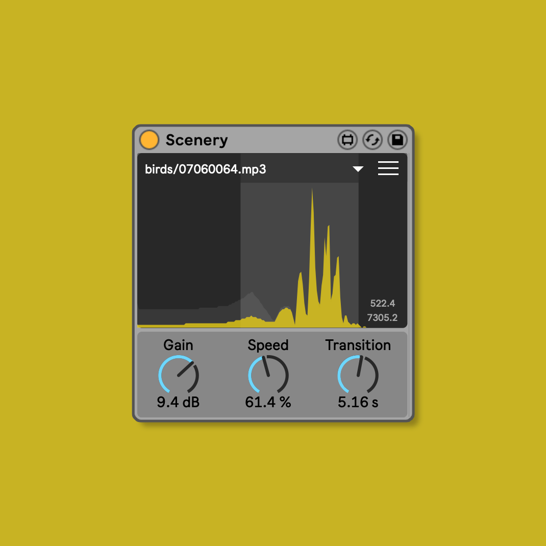 | Description: | Adding a bit of ambience -- bird chirps, street noise, airport chatter, ocean waves -- is a rather underrated and effective method for adding interest to sparse music without having to add additional parts or unnecessary variation. It’s just tedious enough to set up an independently pitched and stretched looping long sample in Live to not even bother, but that’s not the case anymore: Scenery is purpose-built for playing “background sound” in your Live project as quickly as possible, transporting yourself and your music to new inspirational environments with a mouse click. -- I started to really enjoy playing and listening to ambient music when I got into the Eurorack modular world. The only module that never left my case and was used in nearly every session was the Radio Music sample player. In fact, I had two pretty much always plugged into a mixer: 1 for voices/dialogue, 1 for atmospheric texture. It made a big difference in allowing me to play simpler, repeating patterns and sparser arrangements while still drawing the ear with evocative, transportive soundscapes. I found it rather tedious to find the same immediacy in Live. Of course, it’s pretty straightforward technically to play those kinds of samples, but it takes a demotivating amount of clicks and compromises to set up. Even then, samples aren’t designed to continue to play while the transport is stopped, or remain unwarped and looped, or arbitrarily repitched. All this happens with next to no set up with Scenery. -- Scenery is designed to require as little input from you as possible so you can get settled into an environment and stay focused on your music. Once a folder is set, use can be as simple as randomizing the sample and setting low/high pass filters, though you have plenty of configuration at your fingertips for how this process works in the Settings panel. -- While this device is intended for playback of long-form textural samples, meaning it doesn't have the typical music-oriented controls found in other samplers like 12-tone pitch and rhythmic quantization. That may not be ideal when you have a specific idea in mind, but it does open the possibility for some unique playback techniques and creative sound design outside of Scenery intended use. Playing around with a folder of samples and recording the output might just uncover a bit of inspirational gold you can warp to a groove or resample in an instrument. |
