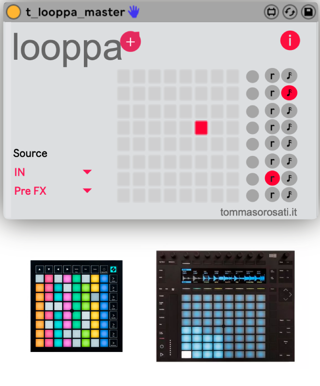 | Description: | 2021 update: NOW also WORKS with PUSH2 !! Looppa is a mlr style looper and freezer in the form of a maxforlive device for ableton live. It allows you to record 8 loops and play them back with a natural system based on the display of the scrolling of the recording and the ability to interact with it. With Looppa you have the possibility to use a Launchpad or a Push instead of a monome and have it at hand inside Ableton Live. In addition, there are new features such as separate pitch and playback rate management. In addition, you can quantize the recording while always remaining at the master time of your liveset. Works with: Launchpad, Launchpad S, Launchpad MK2, Launchpad Mini Mk2, Launchpad Mk3, Launchpad Mini Mk3, Push 2 Maybe: Launchpad Pro Not works with: Launchpad X VIDEO DEMO: https://youtu.be/p9nNgTH6VZs VIDEO DEMO with PUSH: https://youtu.be/m9_tG6ptlao User Manual: https://www.tommasorosati.it/wp-content/uploads/2020/04/looppa_usermanual_new_c.pdf VIDEO PERFORMANCE1: https://www.instagram.com/p/B2W_x35DbSM/?utm_source=ig_web_copy_link VIDEO PERFORMANCE2: https://www.instagram.com/p/Bl8fh6JHDqU/?utm_source=ig_web_copy_link VIDEO PERFORMANCE 3: https://www.youtube.com/watch?v=uB3LEzLV1Rg VIDEO PERFORMANCE 4: https://youtu.be/WwV7nDDCW6Y LAUNCHPAD MK2 configuration: https://youtu.be/vYxkJ6Ilqro LAUNCHPAD MK3 configuration: https://youtu.be/SCoKHE0PYzA |