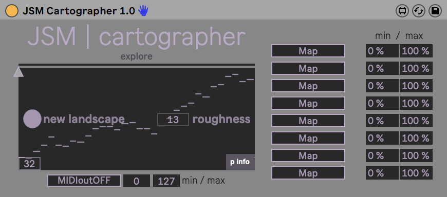 | Description: | Cartographer is a max for live device that maps a slider output to a table of randomized values. It can generate MIDI notes &/or map to 32 parameters in Ableton. Use cartographer to explore a wandering landscape with unexpected peaks and valleys. |