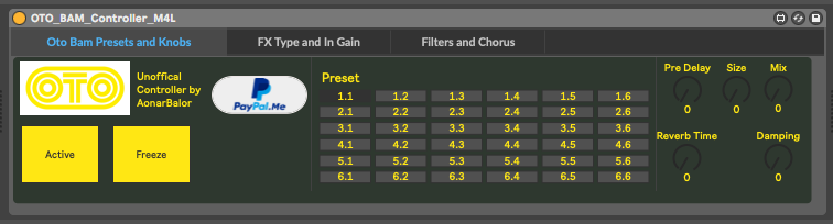| Description: | This controller allows you to select all midi CC parameters within the Oto BAM. LEDs too esoteric? This fills in the guess work. Want instant access to multi button press features? This does that too. However things like saving a preset and changing viewing screen (From Vu to LFO etc) are required as there are no MIDI CC values to change these. Look through the named tabs and you will find all available parameters. Remotely control almost all features in BAM. Note: There seems to be an issue with Gain +1 dB to +4dB. I think this is an issue with the BAM itself so i am going to chase this up with Denis. You cannot remotely select these values but 0dB and then 5+ dB onwards works completely fine. I will chase this up immediately. PLEASE REMEMBER TO SWITCH ALL MIDI FILTERS OFF FOR THIS APP TO WORK!. This is for the 1.4 version firmware for OTO Bam. There is a link to my PayPal. If you find this app useful for controlling your BIM within Max4Live/Ableton , please consider donating so i can make a fully fledged version for Boum. EDIT: Updated so it shows in automation view nicely! I will tidy it up even more soon. |