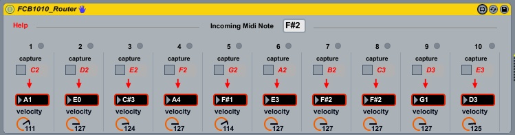 | Description: | This device is meant to be used with a Behringer FBC1010 midi pedal board. The principle is to redirect notes coming from the FBC to scale them to your needs. I wanted to play bass,pad sounds, fx or whatever with the pedal without being forced to go into deep programming of the FBC. Note that, for this version, the FBC must be set up to send midi notes, not CCs. Check the "help" button to get some explanations of how to use it (very simple, in fact). This is my very first Max device... Hope you'll find it useful. It may be buggy though I've tested it and encountered no problem. It does the job... Feedback would be appreciated as I'm a newbie and I'd really like to go further with M4L. Thanks and keep sharing ! Note: I've just added a midi activity led for each slot to visually help a bit ... |