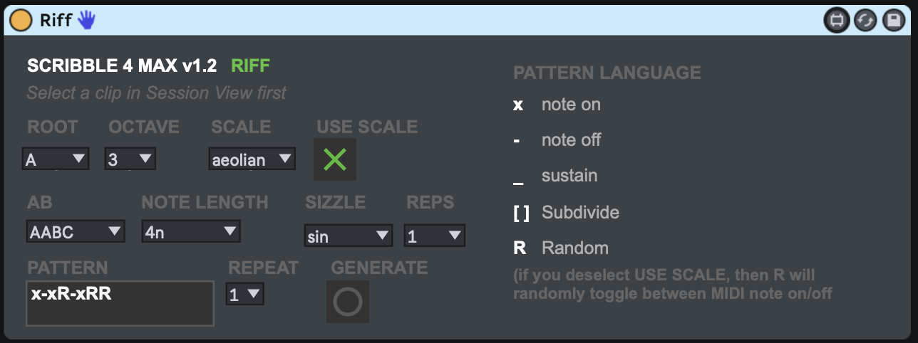 | Description: | Made with Scribbletune (the free and open source JS lib for creating musical patterns with JavaScript) This device is created to use the simple pattern language of Scribbletune to generate quick Riffs. You can choose a scale or mode (over 100) to make the riff melodic. It also has AB parts (and ABC parts) to create interesting riffs and can even be used to create individual drum parts! Demo: https://youtu.be/Gro6LJBJZro |