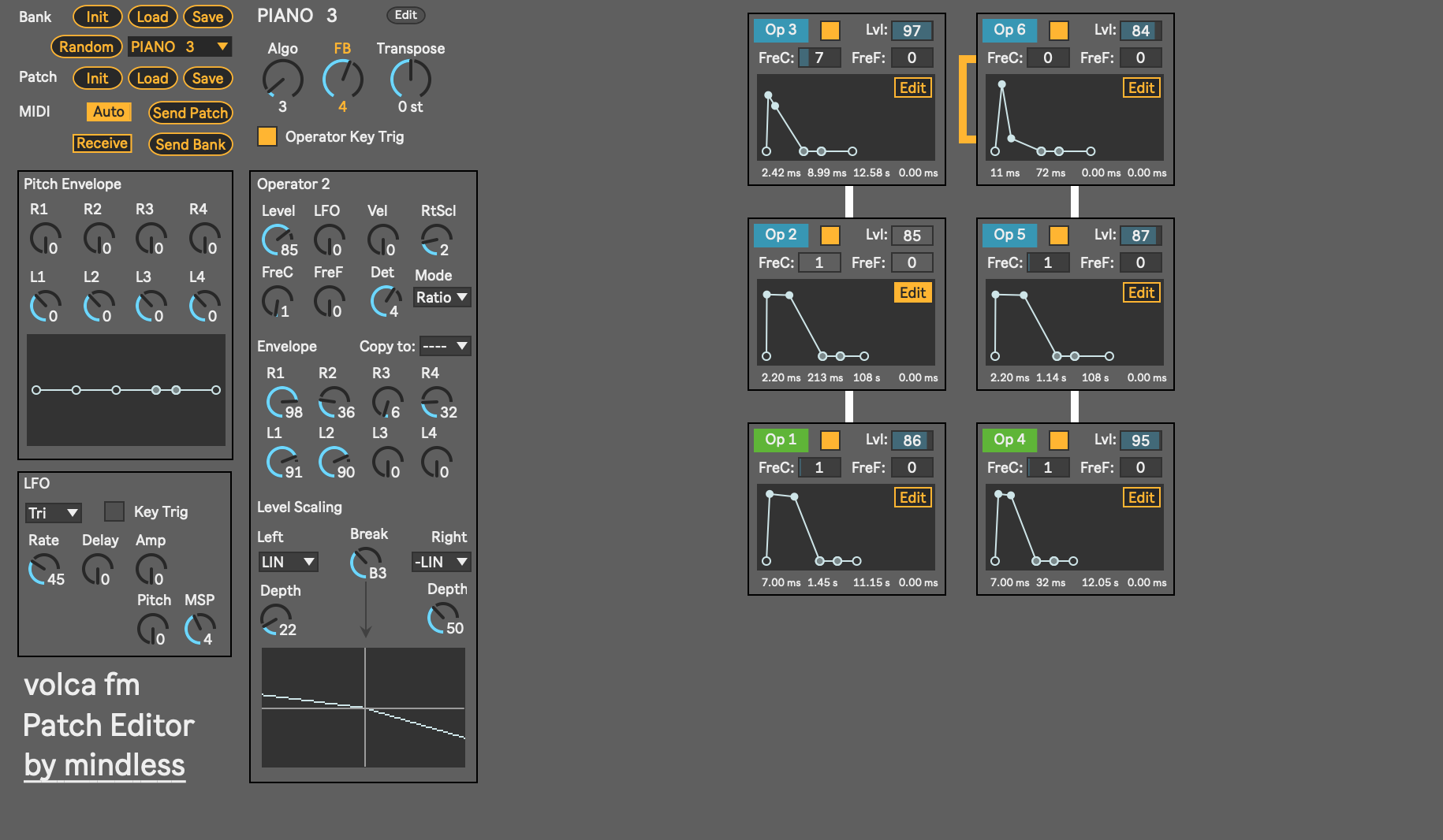 * Intuitive UI to show what's actually going on. Algorithm and operator envelopes front and centre. Live visualisation of Level Scaling. Envelope length and fixed frequency value calculations.
