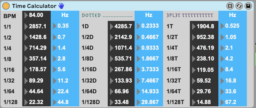 | Description: | This device will calculate the note length in (milliseconds and Hz) based on the BPM input. Useful for timing decay, pre-delay, delay, envelope loops, etc.. to your music. 1/1, 1/2, 1/4, 1/8, 1/16, 1/32, 1/64, 1/128 ... 1/4096 including Dotted and Triplet notes. Time Calculator |