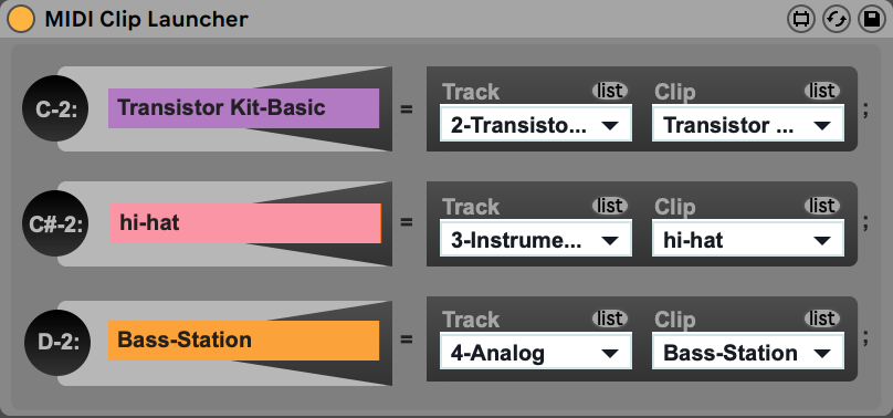 | Description: | Use this device to launch up to three specified Ableton Live audio or MIDI clips by pressing C-2, C#-2 or D-2 notes on your MIDI controller or Computer MIDI keyboard. I created this Max for Live device because I wanted to be able to launch Ableton Live clips using Computer MIDI keyboard, which is currently impossible in Ableton Live. Usage: drop Clip Launcher to an Ableton Live MIDI track and select MIDI/Audio tracks and clips by pressing small ‘list’ button near the corresponding Track/Clip dropdown menus. Choose up to three clips to launch. Make sure the track, where MIDI Clip Launcher resides is armed (record-enabled) to be able to receive MIDI input. Now press C-2, C#-2 or D-2 notes on your MIDI controller or Computer MIDI keyboard to launch specified clips. You can record your performance to the Ableton Live sequencer for further playback. Clip Launcher was tested to work in Ableton Live 10.1/Max 8.1.4 (macOS Catalina/Windows 10). Short video: https://youtu.be/8hAAfBO-s30 Price: $1 Version 1.0 (May 2020) - Initial release My other M4L devices: https://gumroad.com/valery_kondakoff |