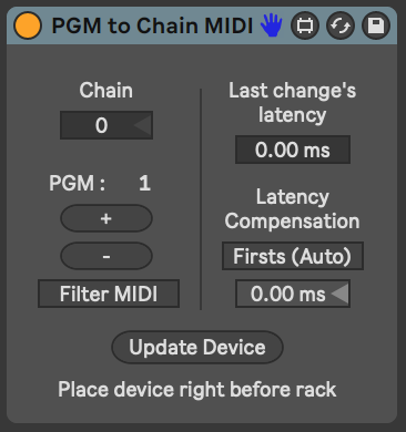 Placed device before rack but the Chain param does nothing. PC messages from the track's MIDI input do nothing.