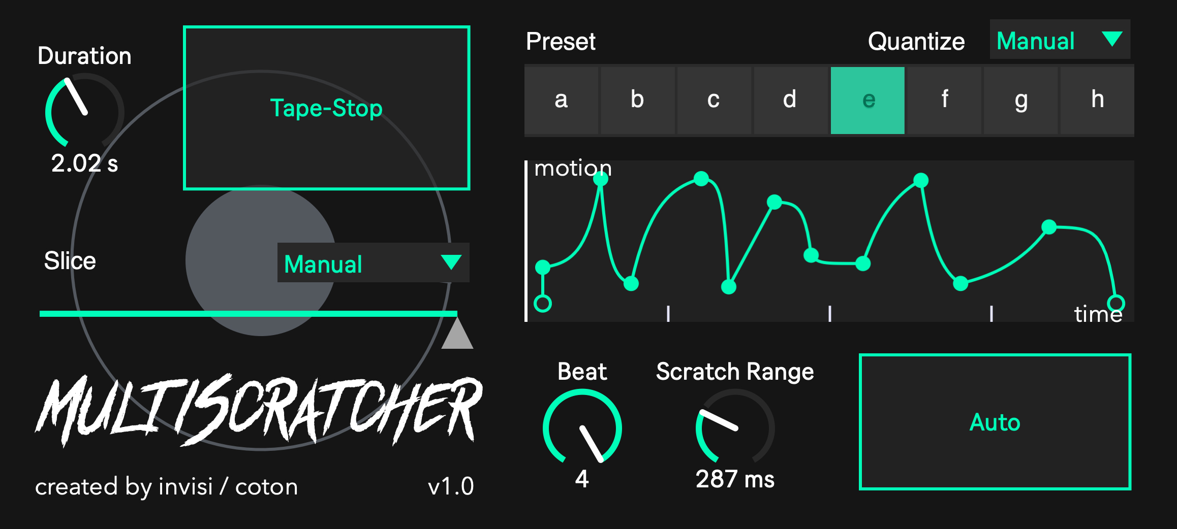 "MultiScratcher" is an audio effect type m4l device that simulates various DJ’s turntable techniques.