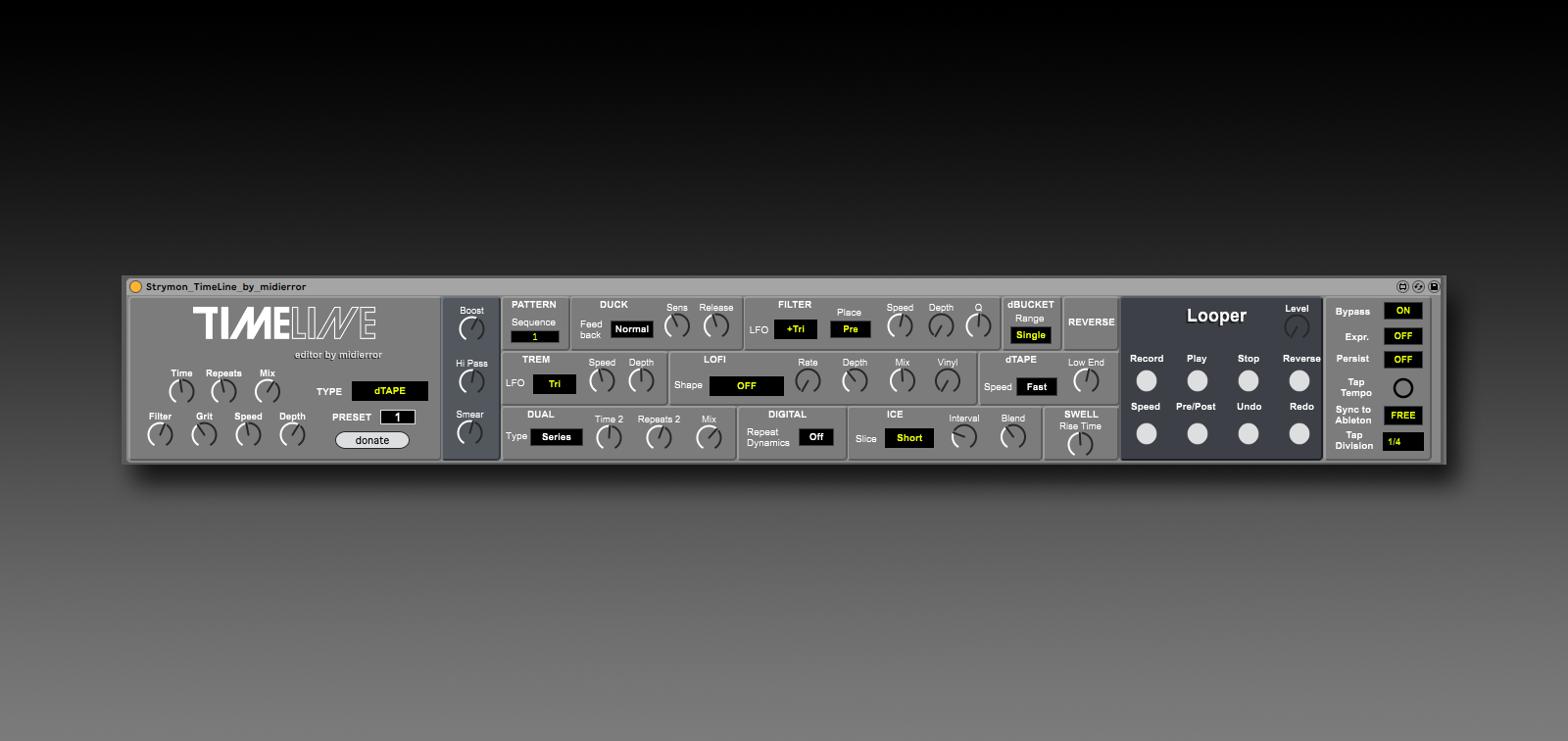 | Description: | A Max4Live editor for the Strymon Time Line reverb pedal - enabling control of all the parameters and storage of their automation within Ableton Live 10. Included in the download are: Install Guide Manual 2 Max4Live AMXD Files Switch between the Digital, Dual, Pattern, Reverse, Ice, Duck, Swell, Trem, Filter, Lo-fi, dTape and dBucket effects by simply clicking the effect title! You can change and automate preset changes using the Preset number. Choose between TWO versions of the editor, with a plain Ableton skin and a snazzy metallic textured version. Send all of the gui parameters to the TimeLine enabling you to load and save patches in your set, and ensure the gui and pedal have corresponding values. Once purchased you can contact me any time using the built in Support button, with questions, ideas and suggestions. If you have any questions about the software, it's functionality or usage please contact me BEFORE purchase, as I do not offer refunds on software downloads. Required software: Ableton Live 10 Suite Required Hardware: Strymon TimeLine Please note: This is not a patch librarian, it will transmit parameter changes to the TimeLine but the software does not load and save patches. However, you may save sounds on the TimeLine, as described in the manual. This product is in no way affiliated with or endorsed by Strymon. |