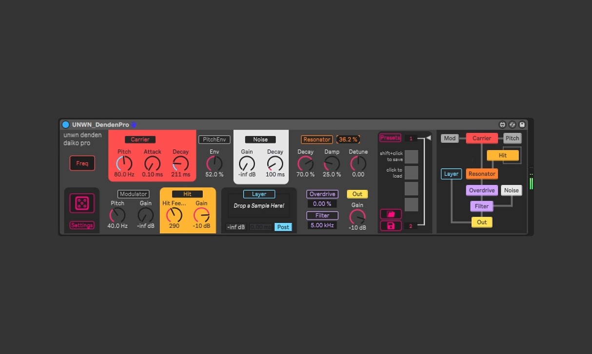 | Description: | After the incredible amount of downloads of the original Denden Daiko I've decided to release its successor! As its predecessor, the Denden Daiko Pro is a powerful but easy to use percussion modeler, make your own Kicks, snares and hats, and now it has now powerful features parameter randomization, a resonator, and the highly requested midi note tracking! |
