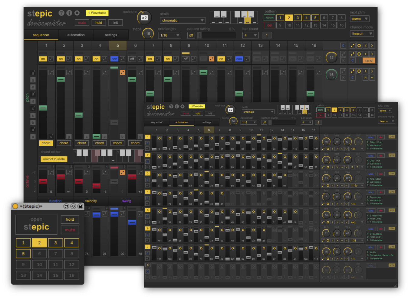 | Description: | Stepic isn’t just a comprehensive 16 step sequencer. Its 8 integrated independent modulation sequencers - each configurable with its own sequence and note length - make it a powerful sound shaping tool with polyrhythmic capabilities. You can map and automate any Live or Midi CC parameter. Want to modulate the filter cutoff or wavetable position of Live's Wavetable?! Simply activate mapping mode in Stepic and select the desired parameter directly from Live's UI. Done! And Stepic has a lot more to offer. A brief overview: • 16 step sequencer. • Per section configurable sequence length (pitch, octave, velocity, ect.). • 8 indipendent modulation sequencers. • Per modulation sequencer configurable modulation target (Ableton Live or MIDI CC). • Individual sequence and note length per modulation sequencer. • Polyphony: Per step chord editor with 6 octave range. • Custom note length option for note- and modulation sequencers (range 1/99 to 99/1). • 16 pattern storage. • Pattern concatenation. • Extendable pattern length up to 16 bars (for each pattern). • Maximum sequence length: 4096 steps (16 steps x 16 bars x 16 patterns). • Step connect option for merging two or multiple steps into one. • Fully customizable scale system. • Over 220 randomization options for almost any device value. • Per section quick shuffle to get results fast. • Per section clipboard (copy & paste) to speed up workflow. • Random step play order. • Various per section retrigger options. • Fully scaleable native user interface. ------------------------------------------------ Release Notes 1.5.0 • MIDI Play (Tranpose, Arpeggiator, Chord Play, Pitch Bend Transpose). • MIDI Mapping • MIDI Thru Release Notes 1.4.2 • Minor bug fixes & optimizations. Release Notes 1.4.1 • Fix: User manual doesn't load (macOS only). Release Notes 1.4 • New: MIDI Export via Drag & Drop. • New: Quick Copy. • New: Parameter Lock. • New: Note Preview. Release Notes 1.3.8 • New: Native Apple M1/Silicon support for Stepic's UI component • Fixed a bug with Pattern Change via Live Automation in Arrangement View Release Notes 1.3.5 • New OpenGL GUI Render Mode • Minor bug-fixes Release Notes 1.3 • New MIDI Target Device Manager • New Modulation Default Value Option: 'Off' • New Pattern Save Mode: Instant • Improved parameter assignment in MIDI CC Modulation Mode • Improved representation of selected Chord and Scales Notes Release Notes 1.2.4 • Pattern Change via Program Change Message (e.g. to trigger pattern changes via Live Clips) Release Notes 1.2.3 • Added pitch note indicators to pitch faders Release Notes 1.2.1 • Added pitch note indicators to pitch faders • Added step number indicators in lower half of UI for better UX/navigation. Release Notes 1.1.1 • Minor bug-fixes and ux optimizations. Release Notes 1.1 • New: Note On/Off Probability. • New: Note Repeat section with Transpose Mode, Range & Offset. • New: Chord Copy To/From. • New: Chord Cycle. • New: Fader option for modulation values. |