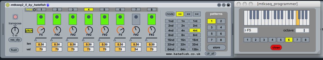| Description: | The mtk (meet the knobbers) sequencer is a simple 8 steps sequencer at its maximum magnificence. The sequncer has been developed for the meet the knobbers event (http://www.facebook.com/pages/meet-the-knobbers/157893047607981) and I hope it will help you in finding inspiration as much it did with me. Here a comment from the previous version: "I just love this sequencer!!! Works marvelously..." "With a combination of launchpad to toggle steps and knobs for everything else." enjoy the new features of the 2.5 version: - the mtk programmer (if you need to tweak carefully your 8 steps melody) - a simply pattern storage device (this means that more improvements are planned in this area) - a more ergonomic GUI any comments are welcome... ver. 2.5.2: - the pattern storage device is now more user friendly -some other tweaks enjoy and let me know |