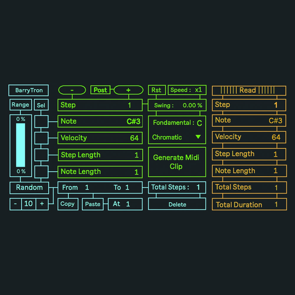 | Description: | BarryTron is a Step by Step Sequencer inspired by the great Orthogonal Device ER101. - Add and Edit Step one by one - Each Step has its owns Parameters : Notes, Velocity, Step Length and Note Length. - Random, Math and Delete Functions for each Parameters - Copy/Paste Function - Global Speed - Swing - Tranpose with notes from C4 to B4 - Scales from Push + User Scale mode - Generate your sequence in MIDI Clip directly on Ableton. - Great Push implementation BarryTron in action with Push : https://www.youtube.com/watch?v=TwkEsnsEufI Thanks to Antoine, Baptiste, Camille, and Thilbault for your Feedback. Thank you Brian for your inspiration. And thank you for your support by buying it ! Don't forget to have Fun :) |