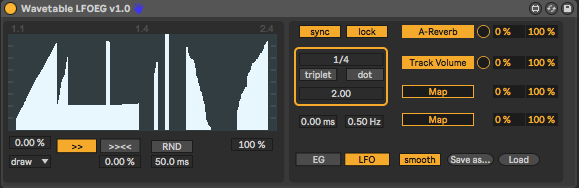 The period/frequency can be sync'd and locked to Live's transport with musical relationships (quarter note, whole note, etc, with triplet or dotted options), or it can run freely.