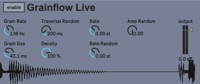 | Description: | A simple m4l implementation of my grainflow.live~ abstraction included in my grainflow package for granulation. Explore the entire package here: https://github.com/composingcap/grainflow |