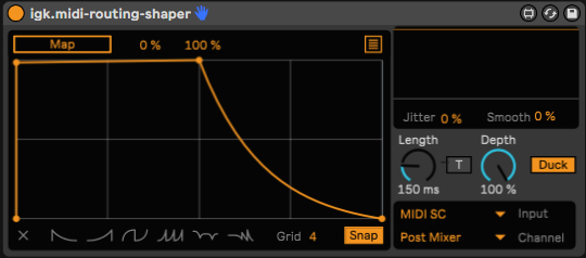 | Description: | Superceded by the Duck Buddy device found here: https://maxforlive.com/library/device/7122/duck-buddy ------ Sample-accurate sidechaining of audio tracks based on MIDI triggers Also allows for mapping of up to 8 other parameters with the same device Requires Ableton Live 11 Download for free by putting $0 before checkout |