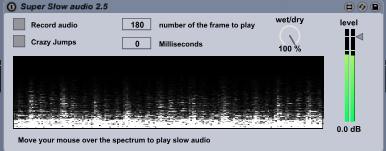 Description: "Super Slow Audio" is an Max4live that slows the incoming audio of a clip applying granular synthesis. It even allows to freeze it completely. Its made with the excelent jean francois charles externals: