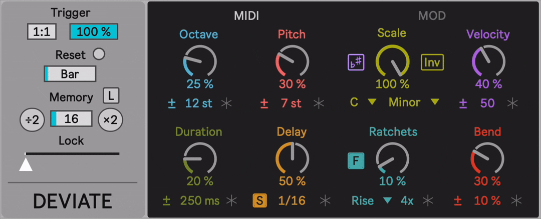 Description: Get inspired with this FREE device that creates endless variations on your MIDI clips or live MIDI input. With a few simple controls, you can humanize performances, create new material from your existing clips, and organically build a track’s momentum. Features a pattern soft lock with a 128 step memory buffer for more predictable deviations. In addition, you can map up to 4 parameters in your Live Set for further modulation.