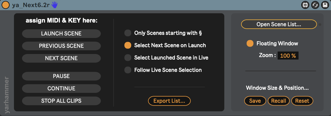 | Description: | ya_Next, a second cue list for Ableton Live. Whenever you need to stay in a pre defined scene order ("cue list") but also want to jump around… ya_Next keeps you in check. It allows to build a cue list out of all scenes or just those starting with "§" in their name. This list is then presented in separate window (i.e. on a second monitor) and can be stepped thru with a single KEY/MIDI button (incl. select next scene on launch)… completely separate from what ever else happens in Live. The show goes on. This device, like all ya_devices, has been created out of a special need many years ago and became an essential part of our show production process. It's not for everyone but who needs it… needs it badly and will never go back to the scary days of a single scene list. Njoy. Version 6.2 now includes an improved window management that allows the position and size to be saved and recalled. Once saved it is also saved with the Live-Set and recalled automatically. |