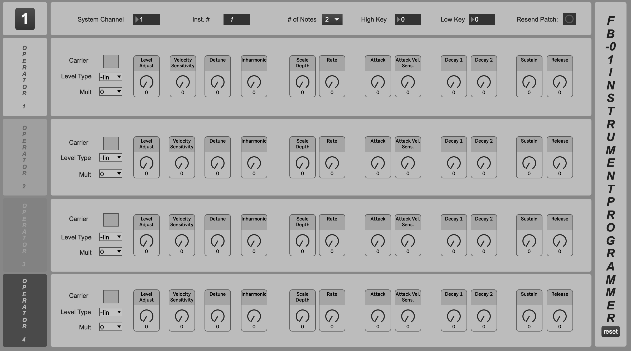 Description: A sysex programmer for the 1986 Yamaha FB-01 4 operator FM synthesizer. Written in Max and Javascript, intended for use in Max for Live. Includes a preset system for saving patches locally, but is not meant as a sysex librarian (for that I recommend Snoize or MIDI-OX).