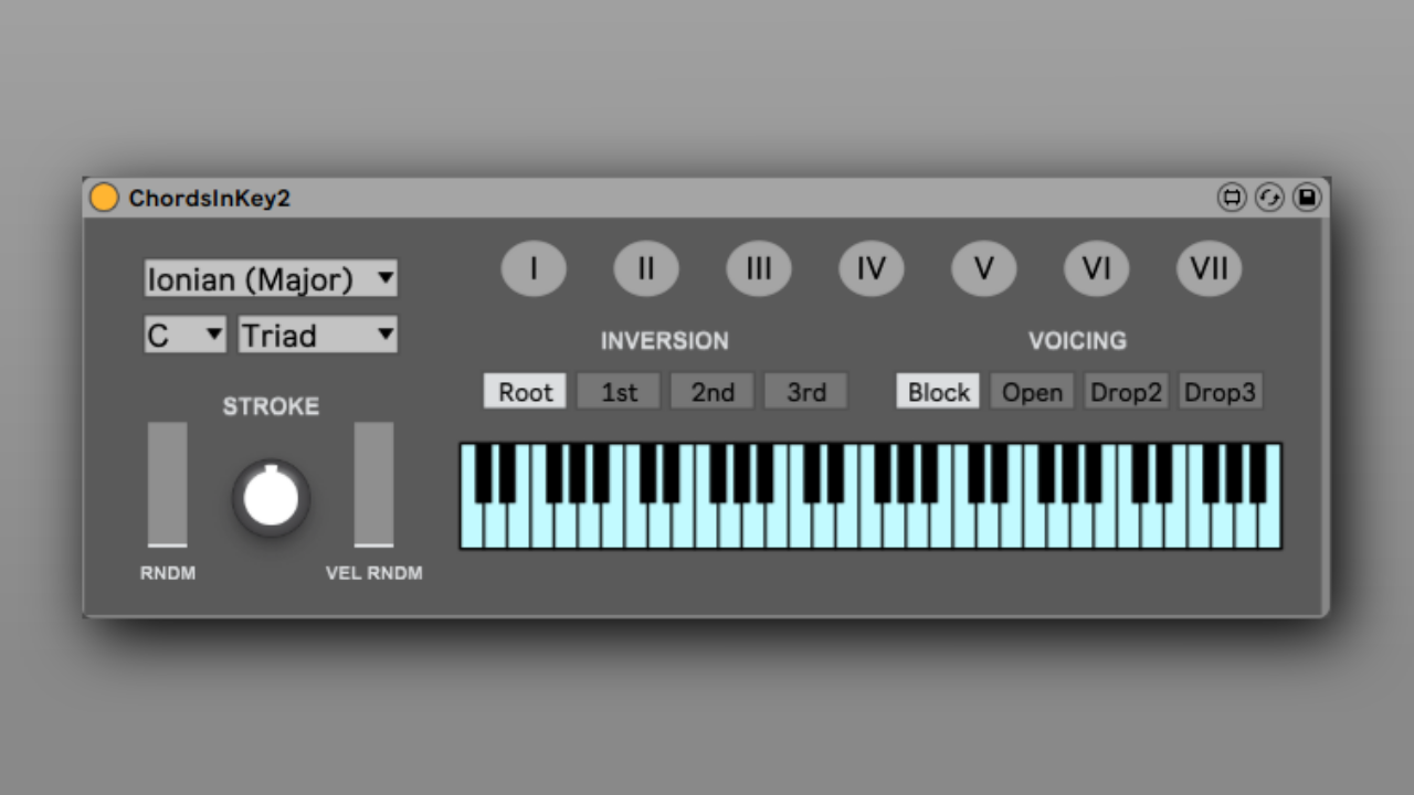 Description: A long requested update of the Chord In Key device, which converts single notes into appropriate chords within a selected key. The notes of the chord can also be strummed like a guitar instead of all at once.