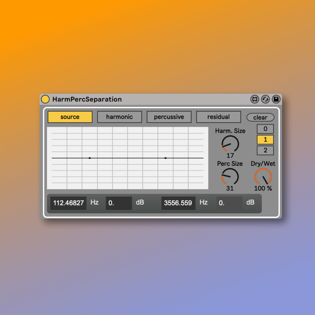| Description: | Harmonic Percussive Source Separation (HPSS) - Audio Effect Adapted from the Flucoma Library's Documentation. (c) FluCoMa. Learn how it works: https://learn.flucoma.org/reference/hpss/ If you enjoy the device, please consider supporting its development here: https://www.paypal.com/donate/?hosted_button_id=X8G45PFSVWDDA ––––––––––––––––––– Change-log v.1.1 GUI Update. |