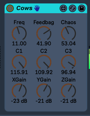 | Description: | Cows is a chaotic noise synth inspired by Chua's circuit. This device takes Chua's noise as a starting point and allows it to go to weirder and much more musical places. I added a wrap function to keep it stable over a much larger range of parameters. Made with code from https://chuaosc.wordpress.com/ if you like this plugin, please donate: https://www.paypal.com/donate?hosted_button_id=GRN7X2DQQQVCW |