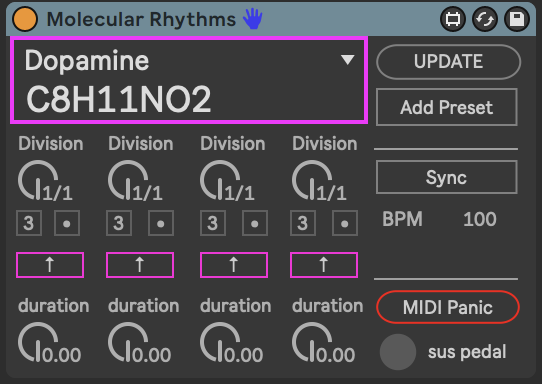 Say you want to hear what Dopamine sounds like. You can input the chemical formula (C8H11NO2), and from there you can select a midi instrument, drum rack or any other midi device you'd like to control, Select a subdivision and play away! When notes are depressed on a keyboard the first note pressed (in the case of Dopamine) will play a sequence in 8 then the following note played will be in 11 and the third note will play in a sequence of 2.
