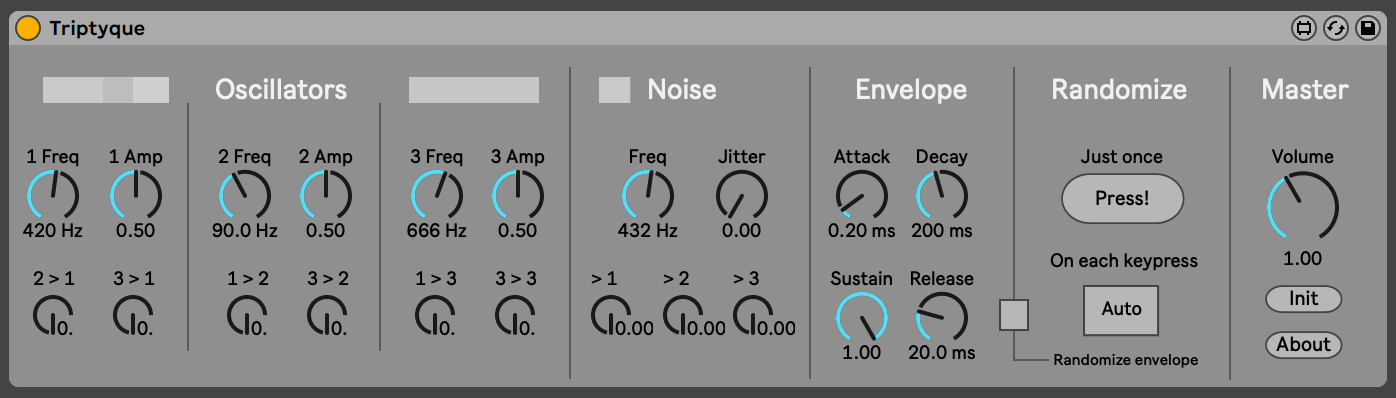 | Description: | Triptyque is a Max for Live synthesiser aimed at creating special effects. At its core lie 3 sinusoidal oscillators, a frequency modulation matrix and a randomization system. It produces sounds somewhere between weird textures, like found in the electronic music from the 50s, and harsh noise mayhem. This kind of patch is generally tedious to create using traditional synthesizers, or straight not possible (due to the fixed nature of the signal path), so I thought it would be cool to have it handy in a quick solution, as well as a good opportunity to learn more about Max/MSP. More info and sound examples can be found here: https://victormorello.com/triptyque.html _____________________ #How to operate:# -Insert Triptyque on an instrument track -Send any MIDI note (the MIDI pitch is ignored, but MIDI note on messages are used to trigger the envelope) -Try out the randomisation features and feel like a mad scientist I suggest to use another audio track to record the output in real time so that you can play around with resampled results! |