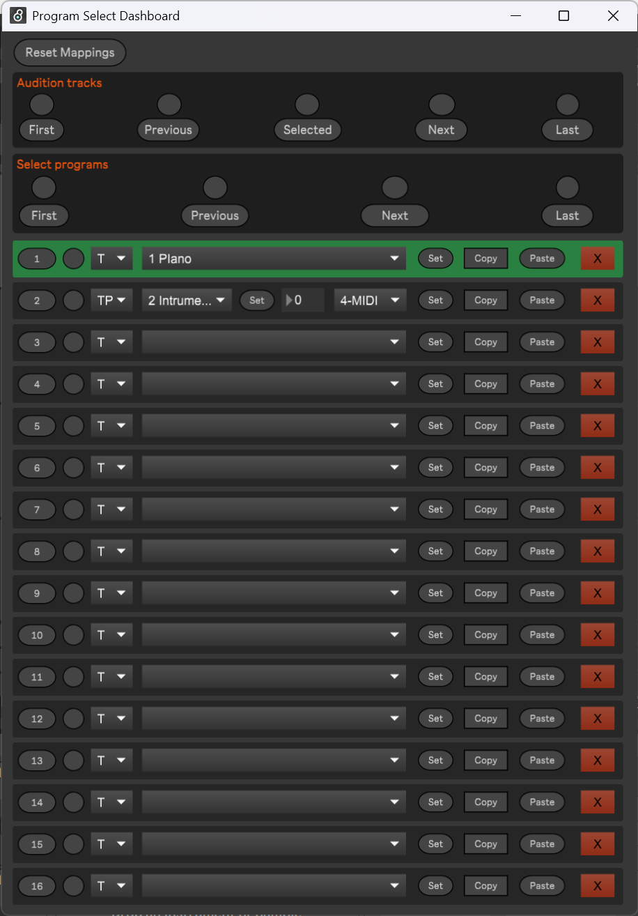 | Description: | UPDATES Fixed crash on adding new tracks Fixed more bugs --------------------------------- I just started learning max4live and wanted to create a device that can help map program select messages from a midi controller to events like arming a track / changing chain selector values in Instrument Rack, etc. This is my first attempt at building any max4live device, so I believe this will have many bugs. Just create a midi track and load this device. You can see two midi mappable buttons to open the device in a popup. You can see the device has 16 slots that can be configured to arm a group of tracks exclusively. These 16 slots can be triggered by program-select messages from a midi controller. Also, you can midi map/ keymap to activate these slots. There are two possible options for all the midi mapping/key mapping. One button should be used for mapping to the midi controller's switches, which send 0 when pressed and the highest value when released. For mapping to note on messages or keyboard keys, use the non toggle mode button. The first, last, previous, and next buttons are also midi mappable similarly. All the configuration gets saved as a part of the live set. I have tried my best to observe track addition/deletion/move and fix the mappings. There are three different modes of operation for each slot. There is a tracks-only mode, where a group of tracks can be exclusively armed. There is a param, only a mode. This can be useful for mapping to a chain selector in an instrument rack. When the program slot is activated, the track containing the instrument rack will get exclusively armed, and the chain selector will be set to the configured value. Param mode can be combined with tracks mode to provide an easy way to layer additional tracks with an instrument rack. Also, note. Exclusive arming only unarms tracks that are configured in some way in this device. This device will not unarm tracks that are not configured for any slot. This can be useful to work with different controllers, which are always on armed tracks and are not affected by this device. As of now, this device works beautifully when used with the Nektar GXP49 which has 10 buttons dedicated to sending program select messages. |