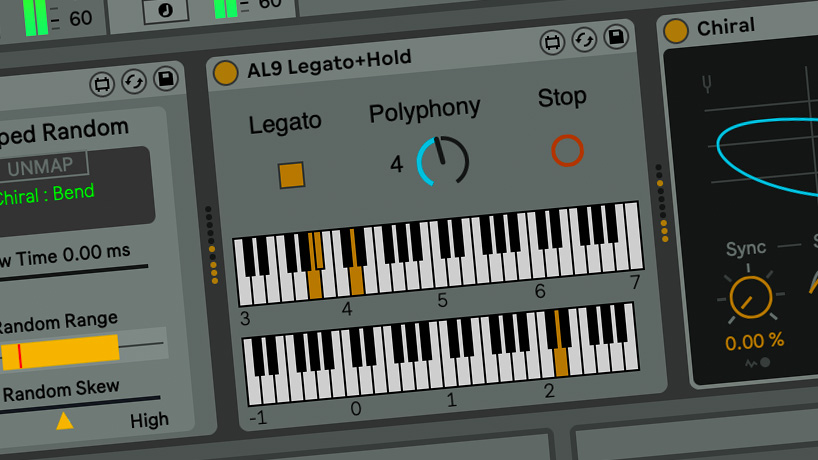 | Description: | This is a device for extending note lengths so that each note is held until another note is played. It also provides a way to use a mouse to click and hold notes indefinitely. This can be tremendously useful for setting up drones or holding looped samples and things like that. Primarily, I developed this to go after an arpeggiator or other note-generation device. Such devices typically have a set note length, AL9 Legato+Hold gives you a way to increase the note lengths to extend across any spaces in the generated MIDI. The "Polyphony" control determines how many notes are held at one time. With a Polyphony of 1, each incoming note will stop the previous note playing. For a setting of 2, the second incoming note is also held, and then the 3rd note played will replace the 1st one. As this goes up, the oldest held note will be replaced by the next note once the number of notes held reaches the polyphony value. That is a very cool thing to be able to do if you like layering your drones. The keyboard display shows you which notes are being held, but you can also click on the keyboard to hold notes. The polyphony limit will be applied to notes added with mouse clicks. You can also stop a held note individually by clicking on it. There is a "stop" button in case things get out of hand. The "Legato" switch enables the note length extension for keyboard input, turn this off to return to normal key on/key off playing. The switch doesn't affect notes added with mouse clicks on the keyboard display. This is a remix of the former "Hold Legato" device. Version 2.1 * avoids hung notes when changing polyphony * duplicate notes don't steal other held notes * minor display tweaks |