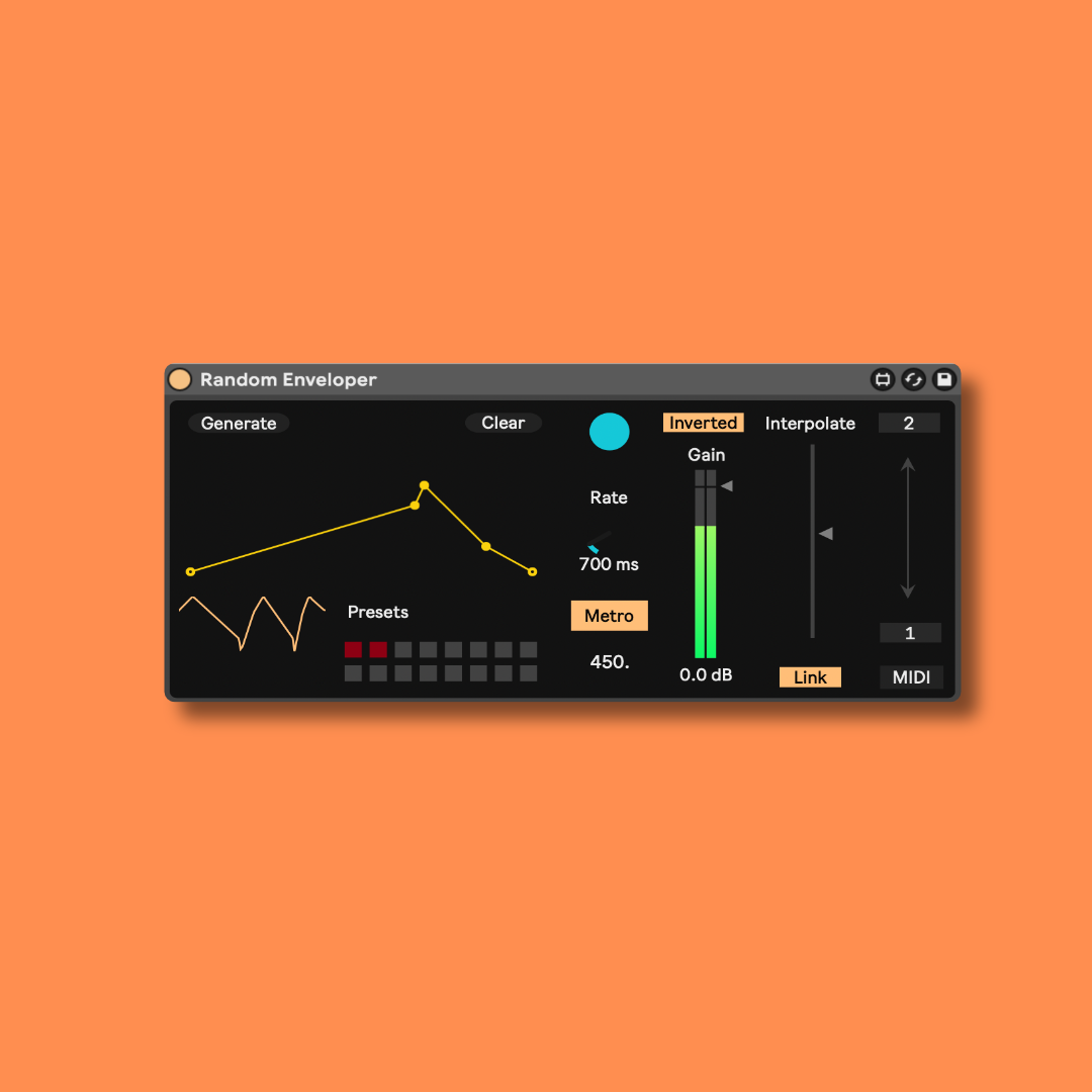 | Description: | RANDOM ENVELOPER v.1.0 Create a random envelope, save it and morph between presets. It can be triggered normally or inverted, either by a random clock, via midi or manually. MAP RANDOM VALUES v.1.0 Legacy device, a super lightweight random modulator. Download: https://ko-fi.com/s/1411869f4c |