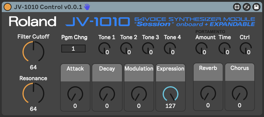 | Description: | Very basic MIDI control setup for Roland JV 1010 |