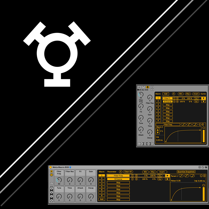 | Description: | Meta Macro basically looks like an Ableton device rack and resembles its macro controls, with a floating view and many convenient functions for Live performance and customization. Map most parameters in Live to the macros, assign custom curves, create snapshots of the macro dial values for a live performance, and much more! The Meta Macro device comes with the following key features: - 8 Macro parameters that can map 2/4/8 parameters(see versions). - "Locate" button in the edit view for each mapped parameter, for easier navigation of the set - "Locate" button on the floating view to easily find the Meta Macro device in the Liveset - User curves for each mapped parameter. Curves can be imported and exported. Quick selector for linear, exponential, and logarithmic curves. - Integrated floating view system (all my devices use this system) can snap multiple floats and arrange them to your liking in clusters - Snapshot functionality (for different) and the possibility to only trigger the snapshot on downbeat. - Exclude the loading of individual macro dials through snapshot loading - Full Midi mapping capabilities for all important functions (done in device view, not on the floating views due to limitations of Max for Live/Ableton Live) - Color Editor to customize each individual Meta Macro instance Please note that there are three versions of the meta macro (capable of mapping 1, 2, 4, or 8 parameters per macro) See the other versions. Update 1.1. - Added live.banks for control surface integration (Push, etc) - Added display of "real" value of the curent parameter instead of 0.-1 to advanced curve editor Update 1.5 - Added the ability to map the macro dials to a control surface script control Gone are the days of tedious manual Midi mappings! The Meta Macro now automatically stores your control surface mappings, so you can easily load pre-configured instances from one set to another. Plus, you can save the Meta Macro nested in a Rack to transfer all your mappings that refer to nested controls. With the ability to change the LED feedback style of your hardware controller, you can now enjoy a fully customized music-making experience. And with the whole mapping logic refactored for increased efficiency, you can focus on creating and performing without any interruptions. Get ready to take your music production to the next level with the updated Meta Macro device. I can't wait to see what you'll create! Update 1.6 - Added Randomize function (can be key or midi mapped) for dials. - Hold Alt/Option key and click on respective button to disable this randomize function for individual macros. - fixed a bug with loading user curves - fixed a bug that broke the lag function - Improved smoothing for parameter values Update 2.0 - Added Color Editor to make floating views easier to identify and customize each individual instance - Hold Alt/Option key and click on respective button to disable this snapshot recall function for individual macros. |