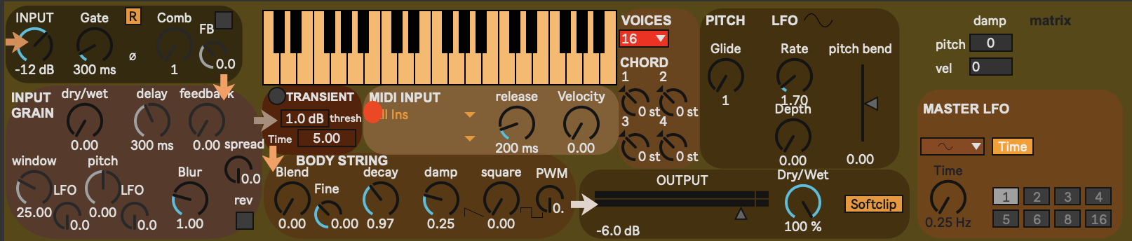 | Description: | Resonator (karplus) audio effect, you can you any type of sound and make it resonate with chords played on midi. Care, sound can grow fast, start with short burst, and let softclip toggle on to begin. I hope it will work.. Thank you :) Soundcloud link : I used the resonator for this kind of stuff for exemple (fx and plucked string ex 0.52, 1:35 ...) Please tell me if it doesn't work :) 07/02 new : damp in buffer feedback path, changed dc filter for more low end, comb filter can be modulated with lfo |