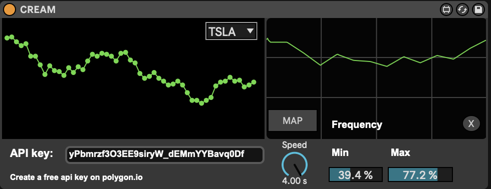 | Description: | C.R.E.A.M - Cash Rules Everything Around Me Use financial stock information to modulate your devices / instruments. ---- Important! The API included in the max for live device is for demonstration purposes only. Since it is rate limited to 5 requests / minute. You should create your own account and use the API key of your account. How To 1. Create an account on polygon.io 2. On your dashboard, select API keys (under DEVELOPERS) from the rightside menu 3. Copy the API key and paste it inside the API key field of the max for live device P.S. you will need to paste in this API key every time you use the device. I haven't figured out a way to save this as a user preset. Or if you have some knowledge of MAX, you could dive inside the patch and replace the hardcoded test API key. Please feel free to contact me if you have questions / remarks / suggestions. ---- https://www.instagram.com/johnymaandag/ |