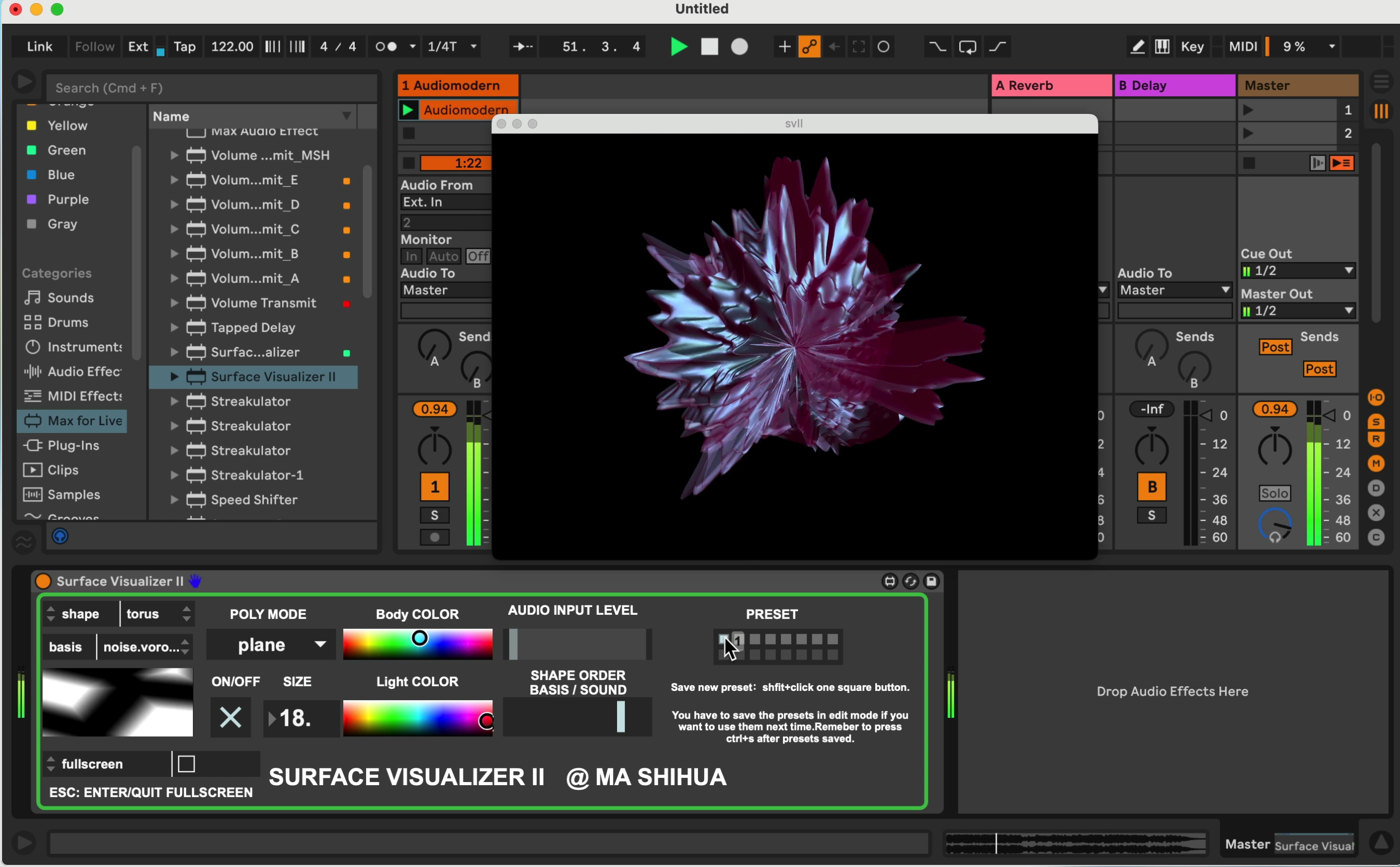 | Description: | This device can provide you with a convenient audiovisual performance function. All you need to do is drag and drop it to the Master track of the Live set, select a preset, or adjust a few parameters. |