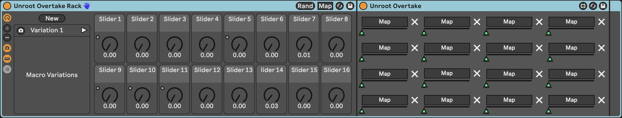 | Description: | If you like Rack Macros and Marco Variations but 16 Macros are not enough - Overtake may help you. Overtake also allows you to use Marco Controls and Variations for parameters outside of a Rack, e.g. with send knobs. It's very simple device with 16 sliders that you can map to plugin parameters that are over the limit of 16 Macros in Instrument Rack. Then, you create another Rack with Overtake inside and map Macros to the 16 Overtake sliders. I know, there are plenty of devices that deal with the 16 Marco limit. I created it for my own use, it's very straight forward and quick to set up, maybe you'll find it useful. If you are looking for an advanced mapper with additional features, I recommend ultimapper32MIDI by mothergarage. Tip: Since you can't launch Variations is different rack with a single MIDI mapping (am I wrong?), it makes sense to split different types of plugin parameters between it's own Rack and Overtake, e.g.: oscillator Macros and Variations in plugin's Rack and filter controls in Overtake Rack. This way you can launch oscillator and filter Variations separately, what can make musical sense. This is an audio device, like LFO, so it goes at the end of the track chain. Audio is passed through without changes. Mapping button comes from Ableton's LFO device, I removed the blinking feature during mapping. So, my work here was minimal. I'm looking for an advanced Max developer who would like to create a few original devices with me, for commercial release. |