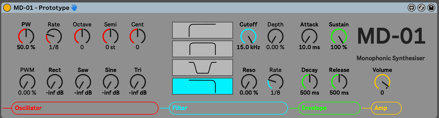 | Description: | A synthesiser designed with synthesis beginners in mind. It's a single oscillator mono synth with rectangle (+ PWM and LFO), sawtooth, sine, and triangle wave shapes as well as an SVF with LowPass, HighPass, Band-Pass, and Notch filter types with a dedicated filter LFO and lastly an ADSR (Attack, Decay, Sustain, and Release) envelope generator. |