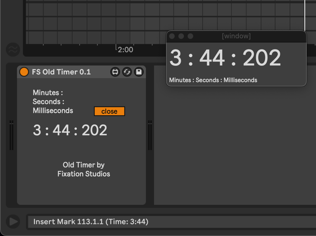 | Description: | A very quick patch I put together for my friend who is a bit of an old timer himself and needs binoculars to see the time readouts in Live's status bar. So I made this for him and posted it here so others can learn from it. Not much testing has been done but its a simple device so there shouldn't be any real issues. Its a great example of using the plugsync~ object for accurate information, converting beats to seconds, dealing with floats and integers and creating a simple floating window. Enjoy! Robert Koster // Fixation Studios // GMaudio Get in touch if you would like to learn Max or Live! |