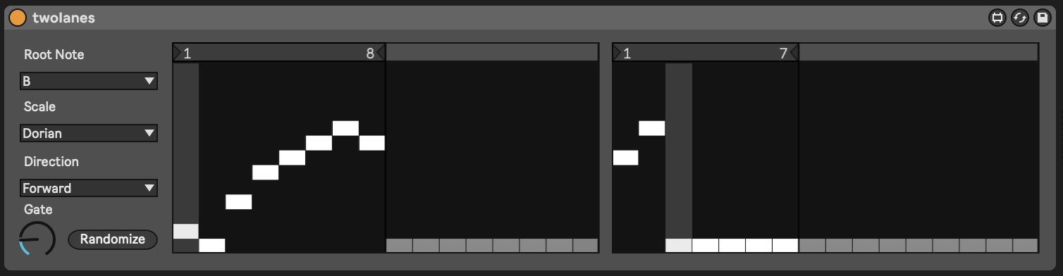 Description: Twolanes is a sequencer for Max4Live inspired by the amazing awake script by tehn for Norns