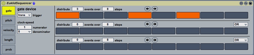 Description: This device uses the euclidan / bjorklund algorithm to distribute an given number of midi notes (events) over a given number of steps.