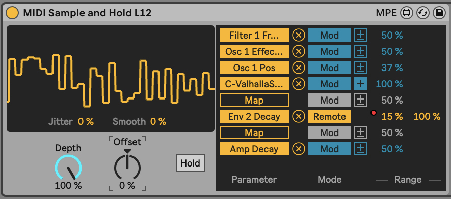| Description: | A modified version of Live's generic modulation LFO. Rather than sending a continuously varying modulation signal, MIDI Sample and Hold sends a single random value with each incoming MIDI note. (thanks to Noah Pred for the idea) Note: this version of the device only works in Live 12 or higher. For Live 11 or lower, please use the original MIDI Sample and Hold (https://maxforlive.com/library/device/6936/midi-sample-and-hold) version 2 Dennis DeSantis March 5, 2024 Changelog: v 2 - added support for true modulation of parameters, allowing for them to still be manually controlled, automated, etc. - the min and max controls are now mapping targets and can be automated v 1.1 - Improved Hold behavior v 1 - Initial release |