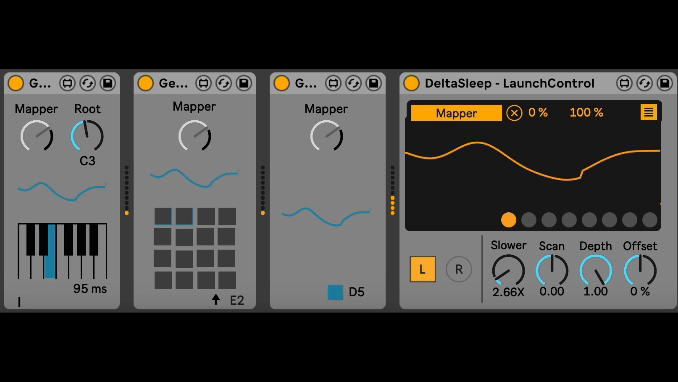 | Description: | The Gesture is a three-device pack that converts any gesture into note patterns. All devices feature a key parameter called the 'mapper' dial. By assigning any modulation signal (such as LFOs, envelope followers, or my DeltaSleep EEG device) to the mapper dial, each Gesture device can 'communicate'. Notes are emitted only when Live Transport is active. Here is a description of each device in the pack: **Gesture - Drum Rack**: Designed for use with Live Drum Racks, this device represents the typical 16 drum pads. Each pad can be toggled on or off to activate or deactivate the corresponding note (e.g., you can keep only the pads triggering the kick, snare, and hat active). At the bottom of the device is an arrow that, when clicked, shifts the root note of the 16 pads. This allows the Gesture device to focus on different pad blocks within the Live Drum Rack. **Gesture - Melody Maker:** Like the Drum Rack, the Melody Maker generates MIDI notes when the Mapper dial is assigned to a modulation signal. However, in this case, you can select the root note around which the notes are generated (defaulting to C3). The note range spans from one octave below to one octave above the chosen root note. The note length can be adjusted via the slider at the bottom (I will soon add the possibility to have note lenghts quantized to Live transport). The piano roll is provided solely for visualization purposes. **Gesture - Whole Scale**: This abstraction features only the standard Mapper dial, as it outputs MIDI notes that directly correspond to the amplitude of the modulation signal. Modulation signals are typically expressed from 0 to 127, matching MIDI note pitch values. Thus, if the modulation signal is at 60 at a given moment, the Whole Scale device will output MIDI note 60, corresponding to C3, and so forth for the entire MIDI note range. Have fun! |