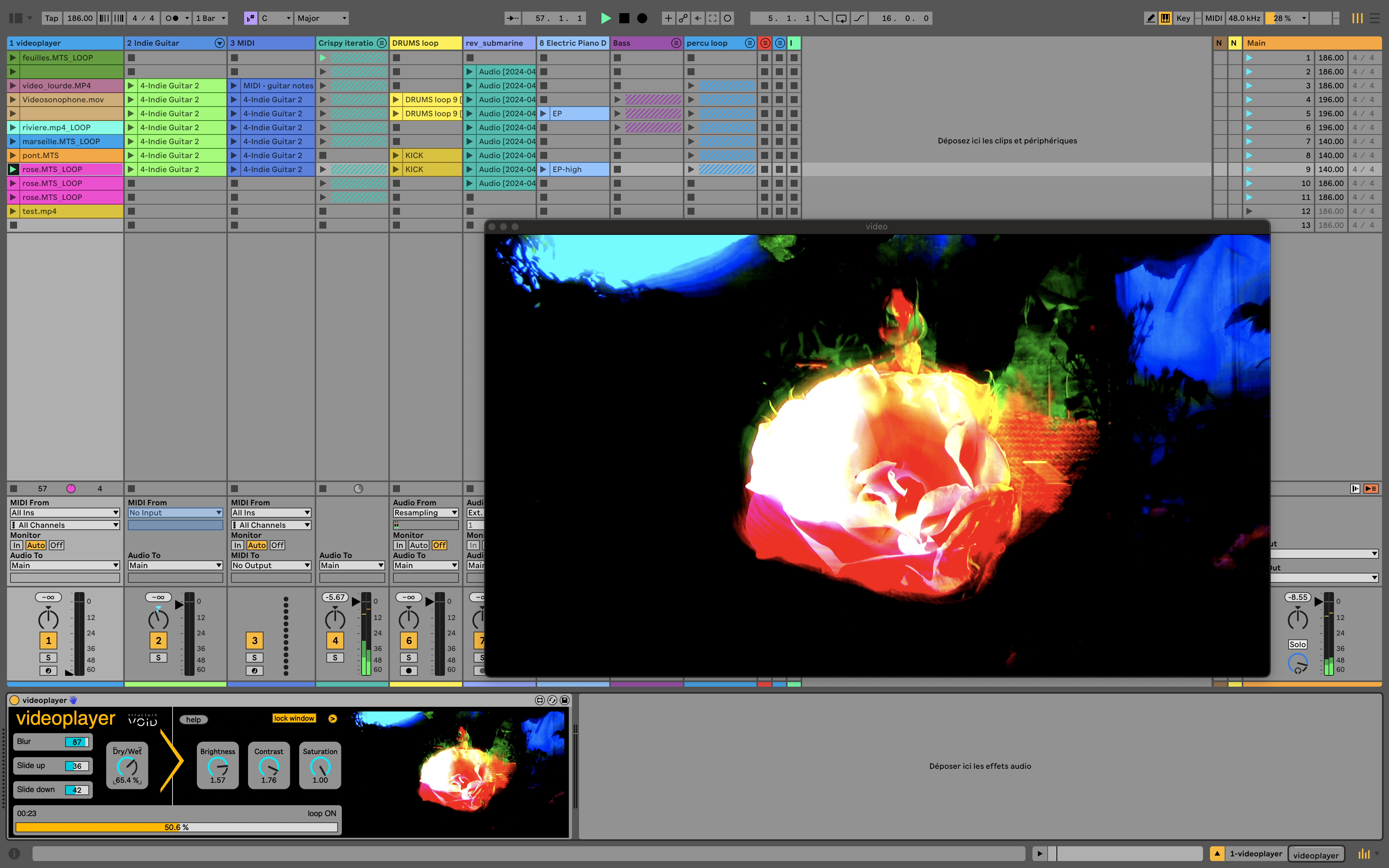 | Description: | videoplayer is a Max for Live device that provides a very easy way to display video files in an external window during your live performances, simply by triggering MIDI clips. ▶️ Watch our videos on how to use it and creative ideas here : https://www.youtube.com/playlist?list=PL1jAw-VM7x1abgF1rQ3ZQrNxescCLLAnt By inserting this device in a MIDI Track, you will be able to launch videos simply by triggering clips you previously named with the video filename (video01.mov). You want to loop the video ? Simply add the string "_LOOP" after the video name (video01.mov_LOOP), for example) and that's it. This device also provides a small triple FX engine (Blur > Temporal Slide FX > Brightness/Contrast/Saturation). Since you are inside Ableton Live, you can use its powerful tools to control and modulate the videoplayer parameters : - by assigning them to a MIDI controller. - by drawing envelopes in MIDI clips. - by assigning them to modulators such as a LFO or an Envelope Follower. Minimum requirements: Ableton Live 11 or 12 Suite or Standard with Max for Live installed. |