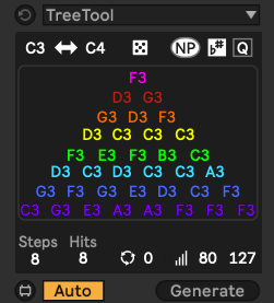 | Description: | 2- completely rewritten in JS, added a selectable mode for note distribution Fit- notes are stretched or compressed to fill the selected space/clip Wrap( old behavior)- notes fill the clip from the start based on the amount of notes and the grid. Added ability to make notes legato. 1.6 small ui fix 1.5 Bug fixes and reworked/removed a few unnecessary things. TreeTool no longer outputs notes until a parameter has been changed. Previously it would add notes to a clip unexpectedly when selecting a clip after opening a project. Added ability to quantize the notes to the current grid in Live. TreeTool is a Midi Generator based on a sequencer I made a while ago. The idea is that there are 8 rows of notes each row with as many choices of notes (step one has one, step two has two etc). It creates a Euclidean pattern and once all 8 rows have been used it starts again from row 1 over and over. You can select the notes by hand or select a range in the top left and click the dice for a random selection of notes for each row. Clicking "NP" will generate a new slightly different pattern from the same set of notes. The Scale button keeps the tool in sync with Lives current Scale. "Q" will quantize the notes position to the current grid in the Clip. At the bottom there are the Steps, Notes and Rotate controls that control the gate patterns for the sequence. All of the available notes are used in order 1-8 regardless of the gate pattern so depending on how many notes you have in the pattern it may not seem as if there's as much variation. If you have a 32 step sequence with only 8 notes you're only running through the pattern 1 time if you have 32 steps and 16 notes you've run through the pattern 2 times etc. In the bottom right are min/max controls for velocity that is randomly generated with each new pattern. Thanks to Philip Meyer for an example on how to turn gate patterns into steps in a clip. If you're not following him on YouTube or other spots I recommend it. Any suggestions are welcome, especially if you can tell me how to implement them. Thanks:) |