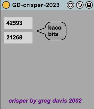 gd-crisper is a Max For Live device that I originally created in the Max/MSP Pluggo environment around 2002 & updated for M4L in 2023. It applies Bitwise and-operation distortion to the incoming signal. Adjust the “baco bits” for desired crispiness / delay factor. |