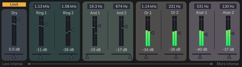| Description: | Mangler / distortion unit that uses sine waves to drive a series of effects. There are 4 effects, and each effect has 2 unique channels, making for a total of 8 layers of distortion that you can mix/pan as you please. Aside from extreme distortion stuff, it also works well when dialed in subtly and modulated to add grimy movement to drums, chords etc. CHANGELOG: Version 0.2 Smoothed pop on device load Fixed modulation range on frequency numbox |