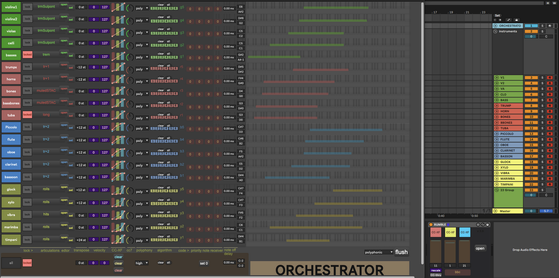 | Description: | The Orchestrator is a Max For live MIDI installation for controlling 20 MIDI tracks with one master keyboard. EDIT articulations lists for Keyswitches, KS are making use of the lowest octave from C-2 ( MIDI note #0 ) the articulations could then be automated in the Live arrangement with proper articulation names. this device is providing tools to orchestrate in real time so you can make, save and recall your own orchestration using the standard Ableton preset system. Requirements: Ableton Live Suite 11.3.12 Youtube demos: https://www.youtube.com/watch?v=s2gv9JH8v5k https://youtu.be/dUgAEQt0PvQ  |