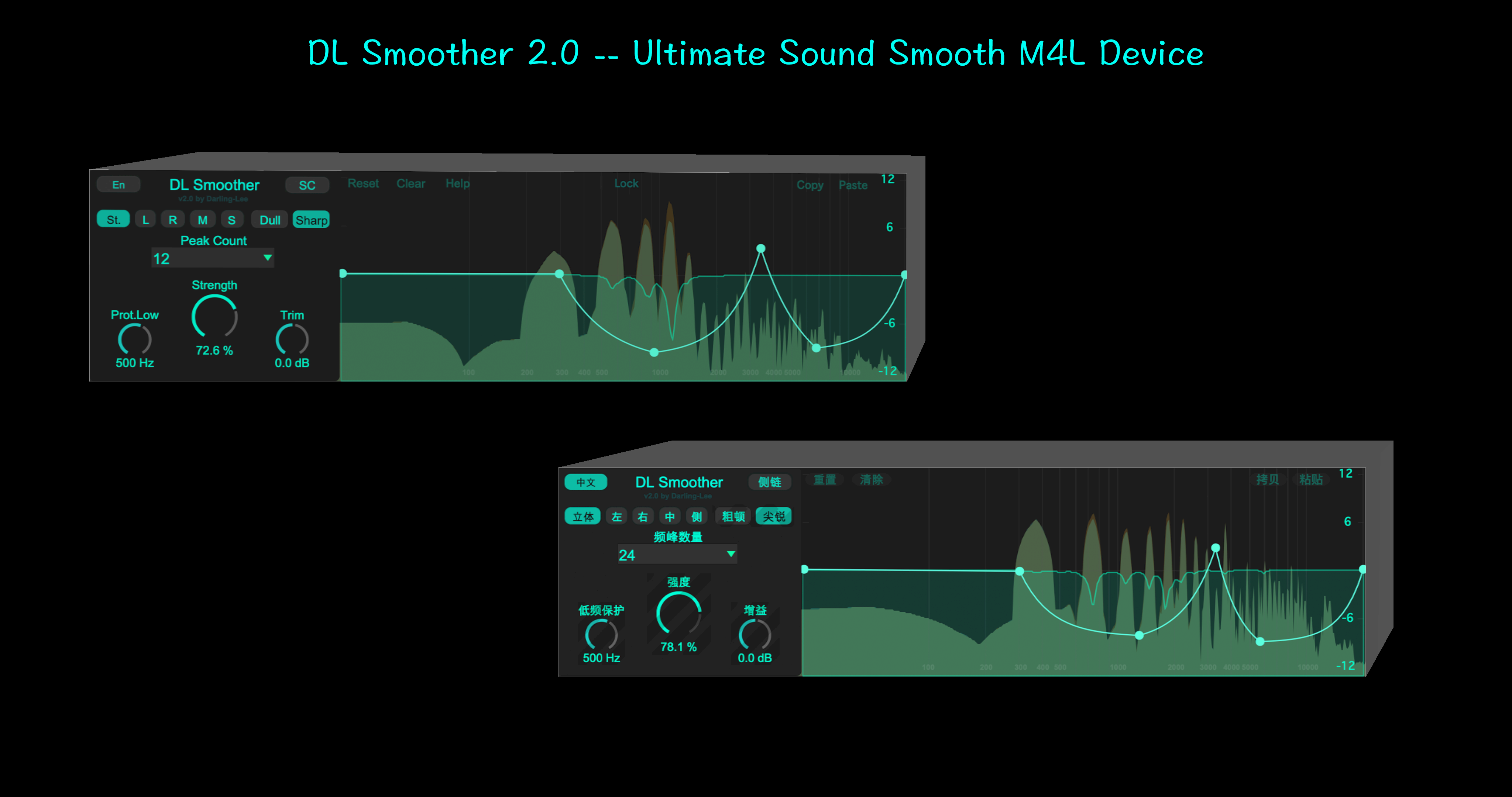 | Description: | An advanced sound auto-shaping plugin made using Max for Live. It features the following: 1.Automatically detects frequency peaks in real-time and processes them based on the amplitude of the peaks. 2.Customizable frequency peak processing control curve to apply different processing to peaks detected at different frequencies, with the option to increase or decrease gain. 3.Option to choose detection and processing of 1/4/8/12/16/20/24 frequency peaks. 4.Adjustable processing intensity, with low-frequency protection. 5.Option to choose detection and processing of stereo/left channel/right channel/center signal/side signal. 6.Supports sidechain functionality. 7.Choose between sharp or smooth curve shapes for EQ processing. 8.Switch between Chinese and English interface languages anytime. Using it, you can achieve the following purposes: 1.Suppress overly strong resonance peaks and harmonic peaks to make the sound smoother and softer. 2.Highlight peak responses in certain frequency ranges to create more distinctive sounds. 3.Use higher low-frequency protection to delicately eliminate sibilance. 4.Automatically detect frequency peaks for a more reasonable dynamic EQ. Recommended environment: Ableton Live 10 Suite or Ableton Live 10 with the Max for Live extension and above, Windows 10 64-bit or higher/MacOS. 一个高级的声音自动塑型插件,使用Max for Live制作。它具有以下特点: 1、自动实时检测声音中的频峰,并根据频峰的振幅大小进行处理; 2、自由定义的频峰处理控制曲线,对不同频率检测出的频峰进行不同的处理,可增益也可减益; 3、可选择检测和处理1/4/8/12/16/20/24个频峰; 4、可调节处理强度,低频保护; 5、可选择检测和处理立体声/左声道/右声道/中置信号/两侧信号; 6、支持侧链功能; 7、你可以为EQ处理曲线选择尖锐或者粗顿的曲线形状; 8、可随时切换中文和英文界面语言。 使用它,您可以达成以下目的: 1、抑制过强的共振峰和谐波峰,时声音听起来更加丝滑柔软; 2、突出某些频段的频峰响应,塑造更有特色的声音; 3、使用较高的低频保护可以做到很细致的消除齿音目的; 4、自动检测频峰,更合理的动态EQ。 推荐使用环境:Ableton Live 10 Suite或带有Max for live扩展的Ableton Live 10及以上,Windows 10 64bit及以上操作系统/MacOS。 |