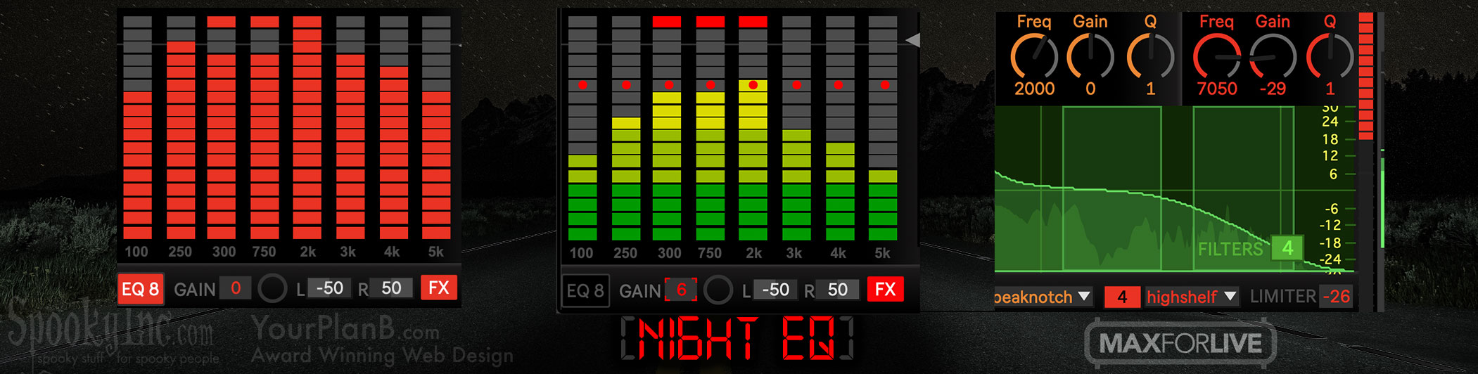 | Description: | An old school style 8 EQ / graphic equalizer in our NIGHT series of Max for Live devices. Chose between standard (green and yellow) and NIGHT mode (red) level meter bars. Slide the eight old school sliders for immediate adjustments to your sound and see the 8 bars adjust accordingly. Or ckick to expand the window to reveal a full modern, fully customizable filter, with a selectable number of filters to adjust exact Freq. and Q and Gain. Just click and drag to adjust the shape and width of the filters. Choose from 1-8 adjustments boxes. (Hint; choose only 1 box to use NIGHT EQ as an auto filter.) Click the side arrow to adjust overall gain control or Balance the stereo levels and adjust the limited level at the end of the signal. |